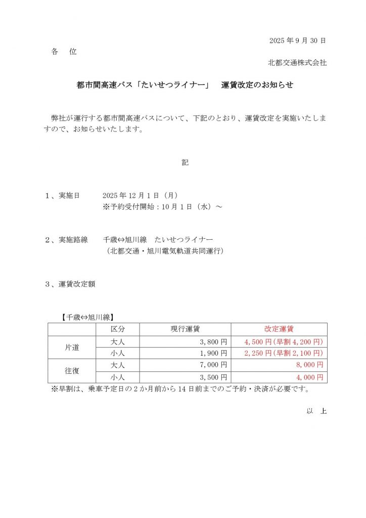 都市間高速バス「たいせつライナー」 運賃改定のお知らせ