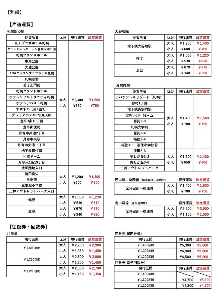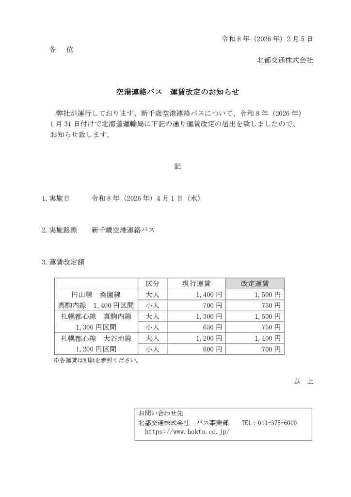 新千歳空港連絡バス 運賃改定のお知らせ